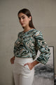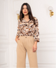 Confeccionada en gasa burbuja, con escote en V y cuello camisero, esta blusa de print atemporal estiliza con discreción y añade un toque de elegancia natural a tu día.
