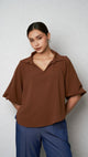 Confeccionada en tela seda francesa, esta blusa se destaca por su detalle piezado en las mangas anchas y acampanadas, que le dan un estilo fluido y relajado.