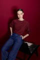 Confeccionada en tela angora Milano, esta chompa destaca por su textura suave, mientras los volantes en las mangas aportan un toque femenino y distintivo a la prenda.