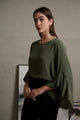 Confeccionada en tela satin hindú, esta blusa destaca por su manga caída elasticada y los volantes delicados que rodean suavemente el contorno del brazo.}